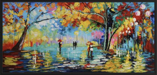 Je kijkt naar het schilderij, een kleurrijk park gevuld met mensen die een avondwandeling maken onder de straatlantaarns. De warme tinten geven je een gevoel van rust, alsof je zelf daar zou kunnen zijn en de koele avondlucht zou voelen. Elke keer dat je naar het schilderij kijkt, word je aangetrokken door de harmonieuze sfeer die door de kleuren en het licht wordt gecreëerd. Het is alsof de hele kamer gevuld is met de ontspannen energie van een stille avond in het park.