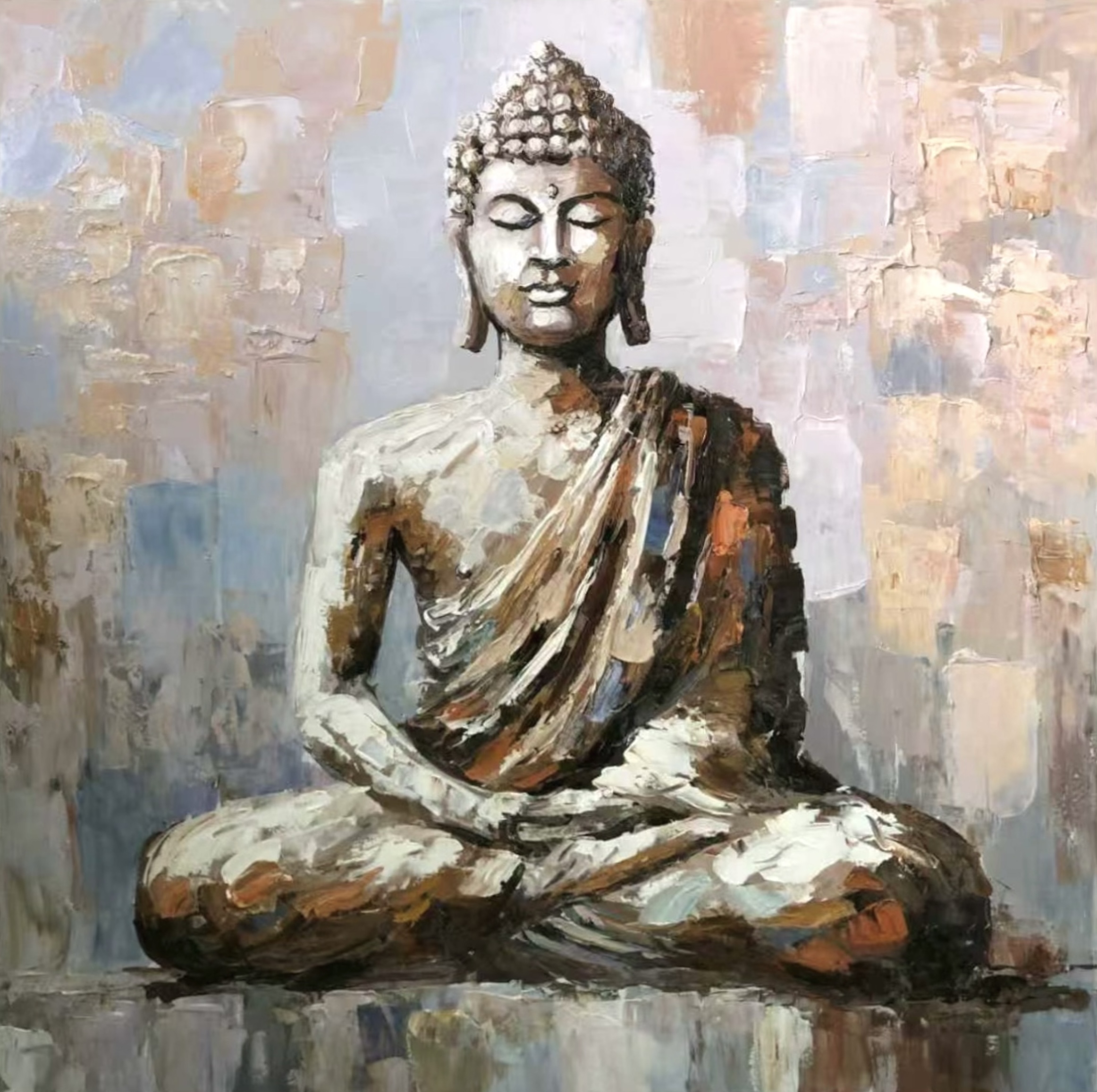 Buddha Impasto vangt het moment van volledige stilte – de pauze tussen ademhaling en gedachte. Het is geschilderd in impasto-techniek, waarbij lagen verf ritmisch worden opgebouwd om diepte en structuur te creëren.