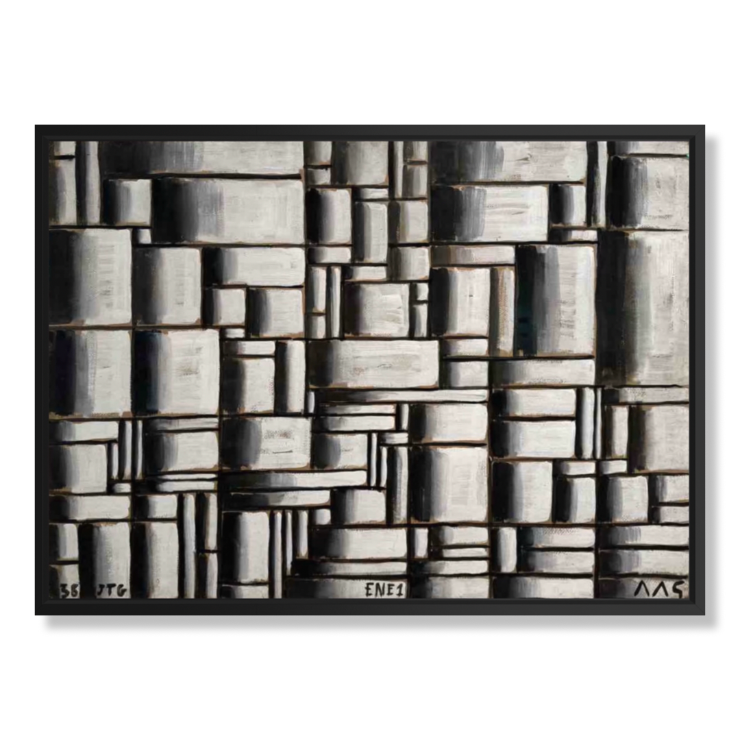 Gedrukt op canvas en volledig gemonteerd in een zwarte zwevende lijst – strak en grafisch. Klassieke moderniteit ontmoet eigentijdse esthetiek – een visueel statement met precisie en karakter.