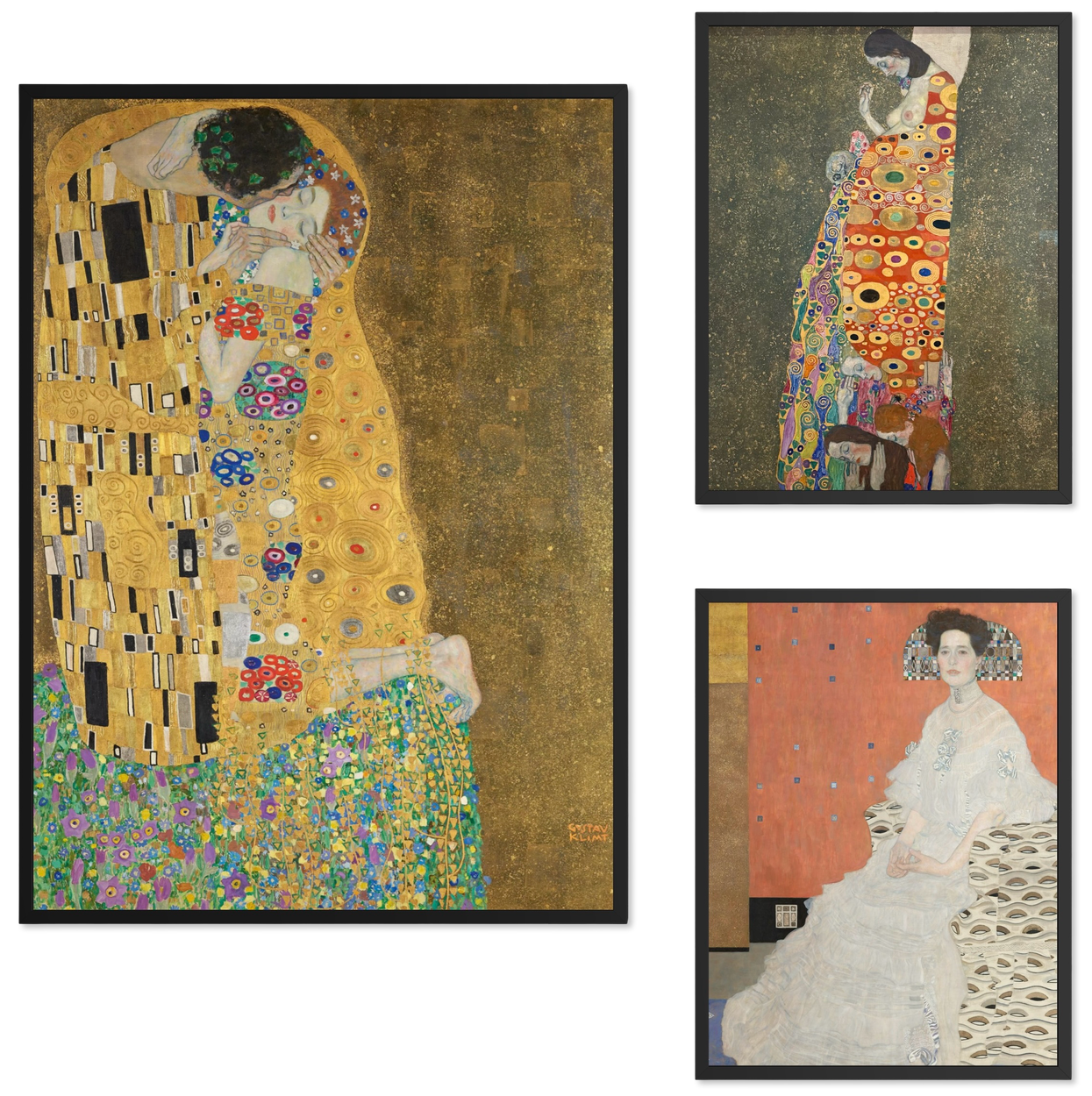 Een exclusieve trio binnen Tijdloze Meesterwerken: Klimts gouden symbolen van passie, kracht en hoop – opgespannen op houten spielatten voor een verfijnde galeriepresentatie.