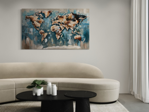 Elke keer dat je naar je schilderij kijkt, voel je een verlangen om de wereld te ontdekken. De aardse tinten geven een gevoel van geborgenheid, terwijl de blauwe en witte nuances fluisteren over de oceaan en vrijheid. De diepe structuur, gecreëerd met het paletmes van de kunstenaar, brengt het motief tot leven. Het is niet zomaar een kaart – het is een droom van avontuur en eindeloze mogelijkheden.